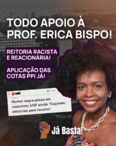 Os processos de seleção são enviesados e cumprem um papel de contenção da entrada de professores negros na maior universidade do país, por isso, mais que nunca é preciso lutar, assim como foi a luta para a implementação do sistema de cotas em 2017, que arrancou as cotas após muita pressão do movimento estudantil, movimento negro, indígena e dos trabalhadores em unidade. Esta luta também precisa estar articulada com as mobilizações por cotas trans na USP e por permanência! Esta mesma reitoria da vanguarda do atraso que negou a vitória de Erica e que aplica ataques racistas na universidade é a que nega o ingresso de pessoas trans, cortou mais da metade dos auxílios PAPFE este ano e segue aplicando a brutal precarização e crônica falta de vagas no CRUSP.